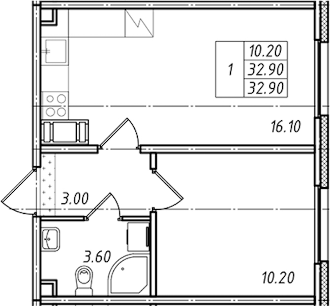 - Площадь32,9 м2