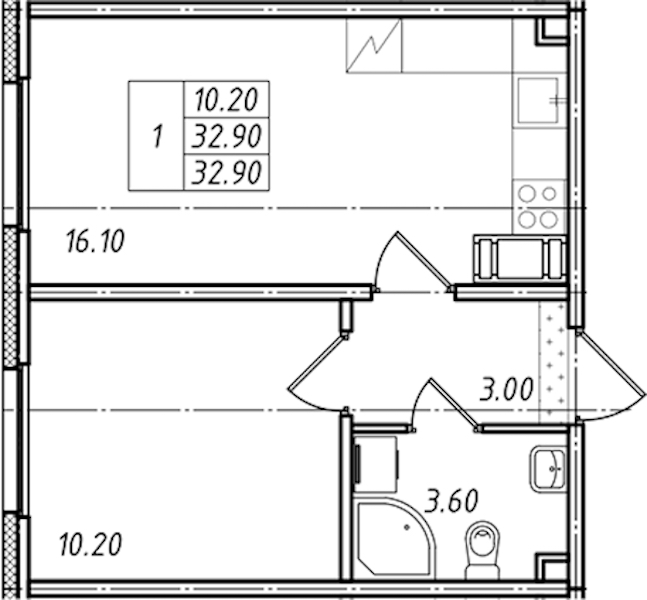 Однокомнатная квартира на 16-ом этаже 32,9 кв.м