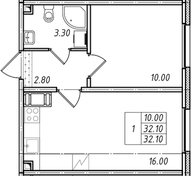 Однокомнатная квартира на 11-ом этаже 32,1 кв.м