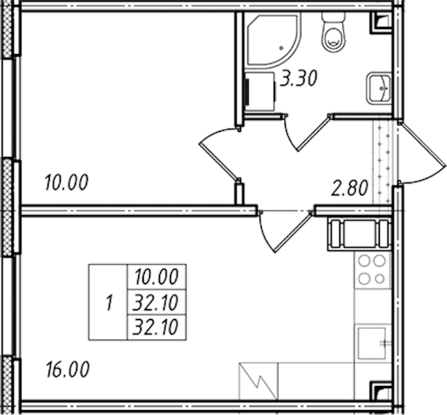 Однокомнатная квартира на 15-ом этаже 32,1 кв.м