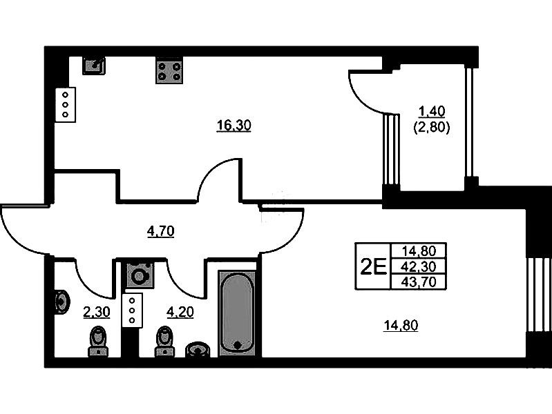 - Площадь43,7 м2