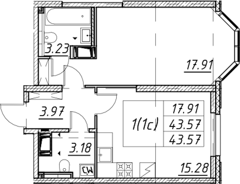 - Площадь43,57 м2