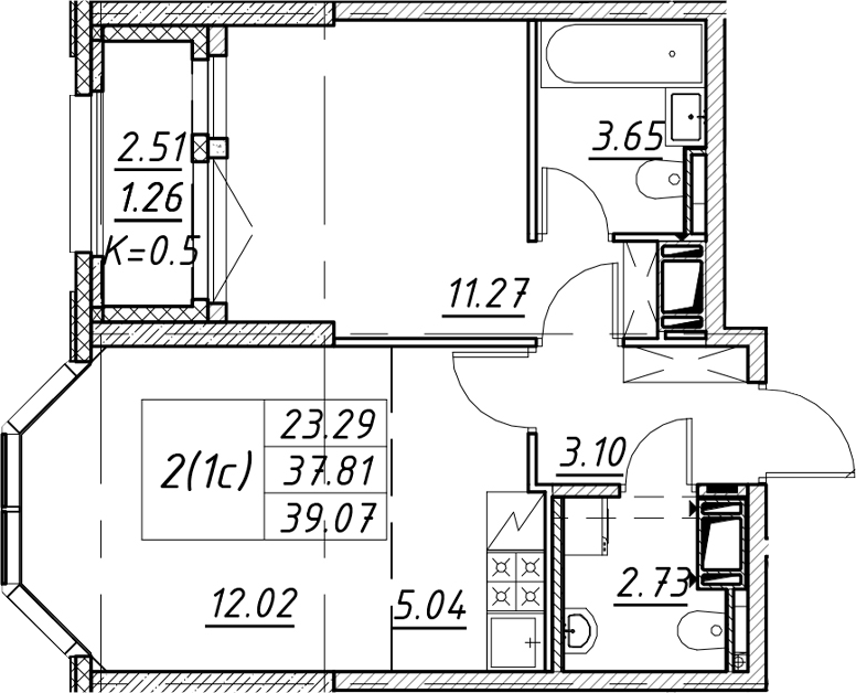 - Площадь39,07 м2