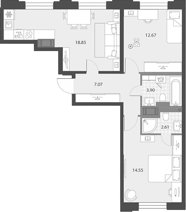 - Площадь кухни18,85 м2