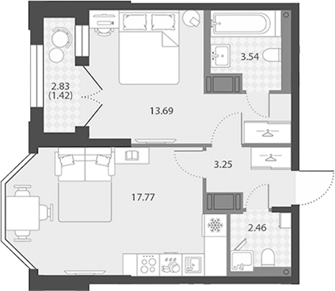 Однокомнатная квартира на 7-ом этаже 42,13 кв.м