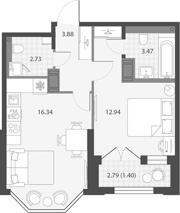 • Площадь кухни16,34 м2