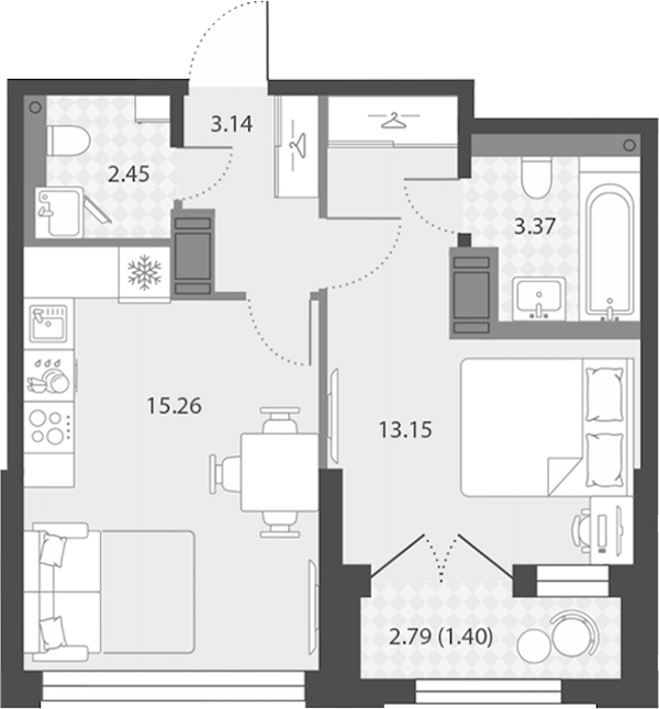 - Площадь кухни15,26 м2