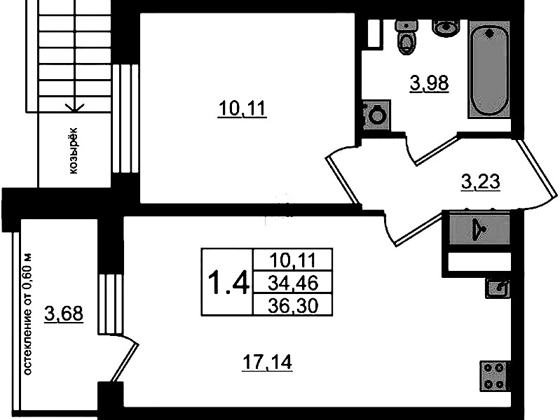 Однокомнатная квартира на 1-ом этаже 34,46 кв.м