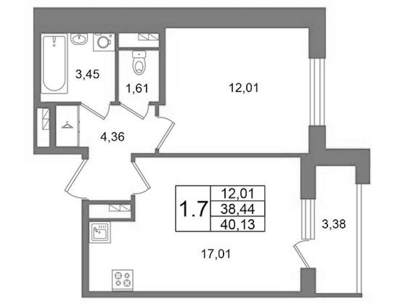 Однокомнатная квартира на 3-ем этаже 38,44 кв.м