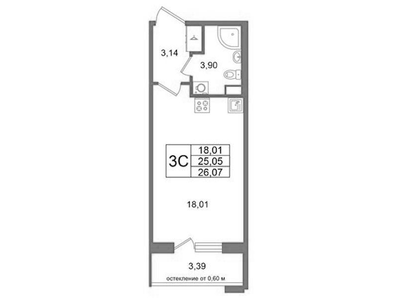 Квартира-студия на 1-ом этаже 25,05 кв.м