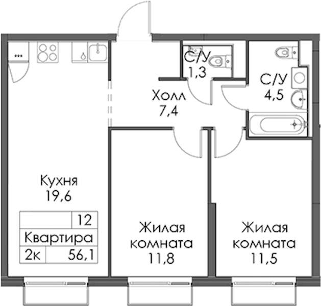Двухкомнатная квартира на 4-ом этаже 56,1 кв.м