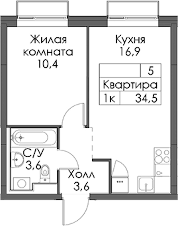 - Площадь34,5 м2