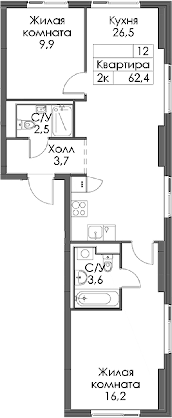 - Площадь62,4 м2