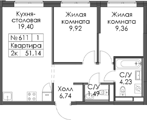 - Площадь51,14 м2