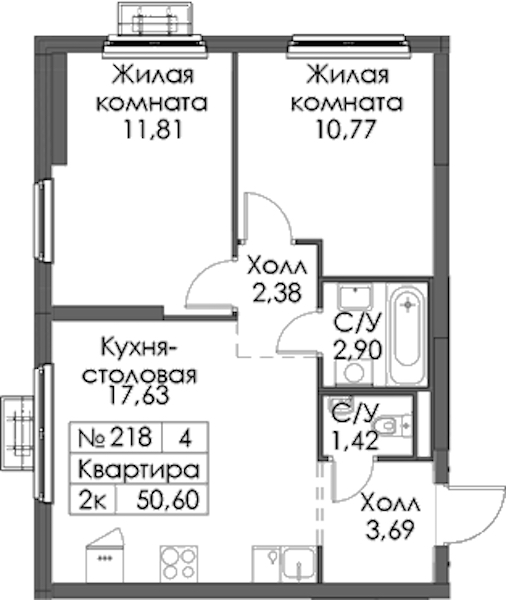 - Площадь50,6 м2